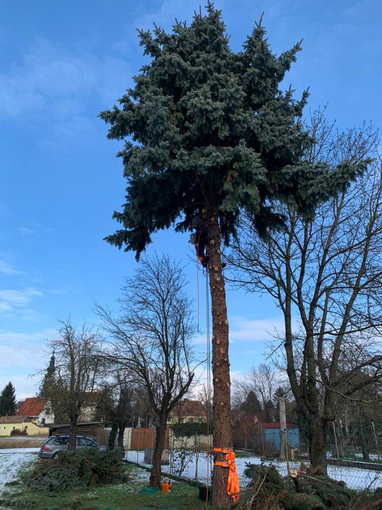 Durch Erfahrung und enge Zusammenarbeit mit Spezialisten, ist es möglich, Bäume mithilfe von Klettertechniken auf kleinstem Raum abzutragen.